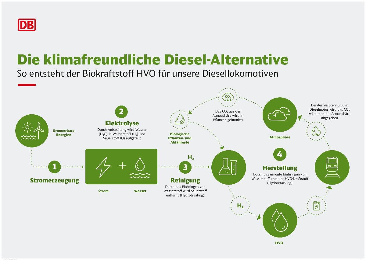 Aus diesem Grund setzt die Deutsche Bahn mit dem Biokraftstoff HVO auf eine pragmatische Lösung als Übergangstechnologie, um ihre Treibhausgasemissionen kurzfristig reduzieren zu können. Gleichzeitig arbeitet der DB-Konzern weiter an Innovationen für eine nachhaltige und klimaneutrale Mobilität der Zukunft – wie etwa am Einsatz von Wasserstoff und Batterie-Technologie – und an der weiteren Elektrifizierung des Streckennetzes.