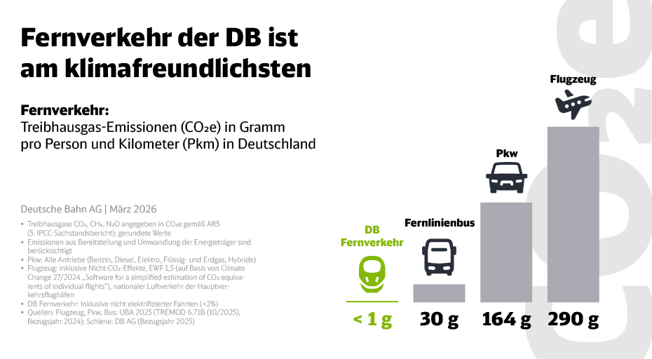 So ist der Fernverkehr der Deutschen Bahn das klimafreundlichste Massenverkehrsmittel in Deutschland. Dieser Vorteil ergibt sich vor allem durch den Einsatz von Ökostrom beim DB-Bahnstrom. Bis 2030 soll der Anteil erneuerbarer Energien am DB-Bahnstrommix auf 80 Prozent steigen. Bis 2038 wird der Bahnstrom auf 100 Prozent Ökostrom umgestellt.