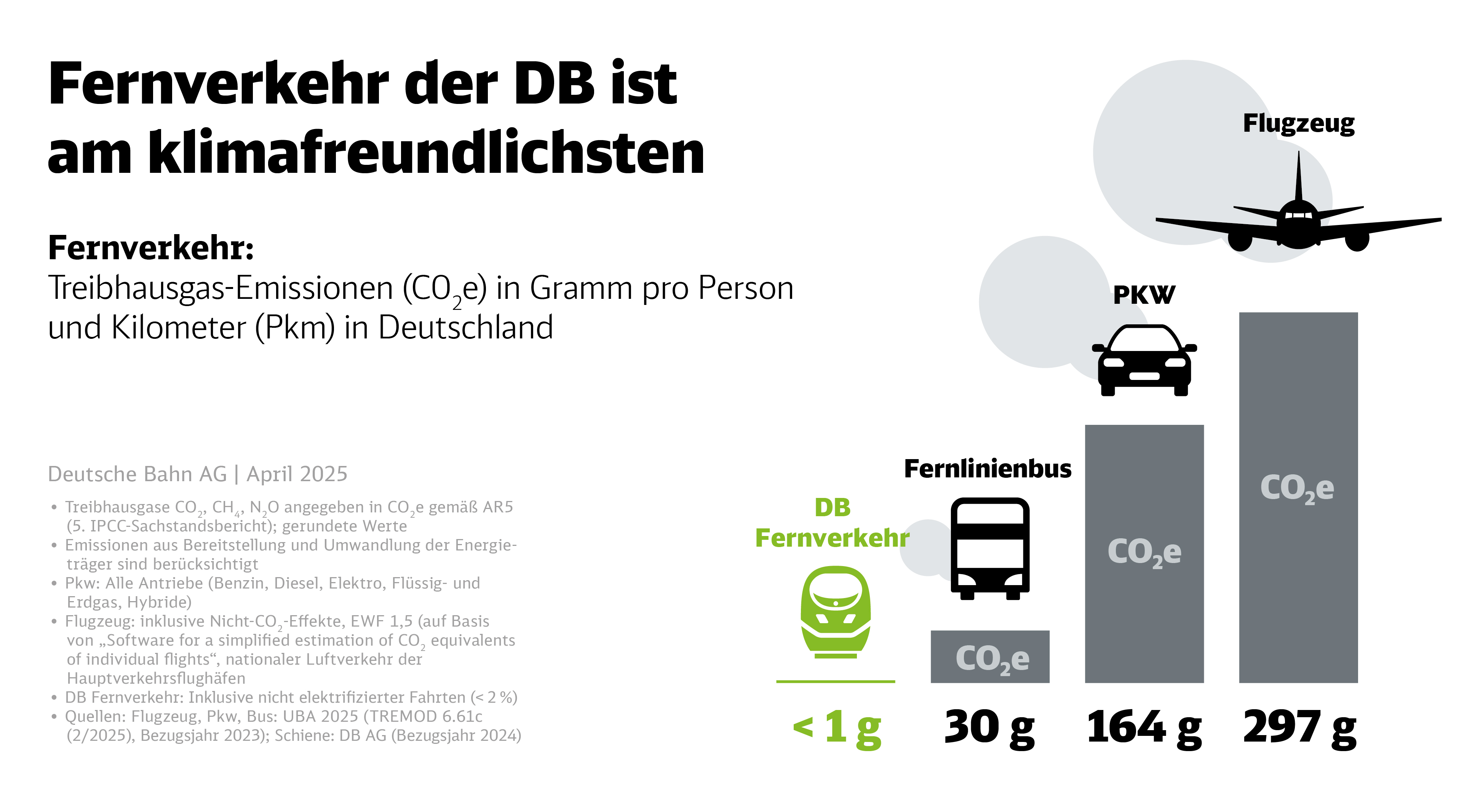 Wie klimafreundlich der Fernverkehr der Deutschen Bahn im Vergleich zu anderen Verkehrsträgern ist, zeigt auch folgende Grafik. Hier werden die durchschnittlichen Treibhausgasemissionen in Gramm pro Person und Kilometer in Deutschland dargestellt: