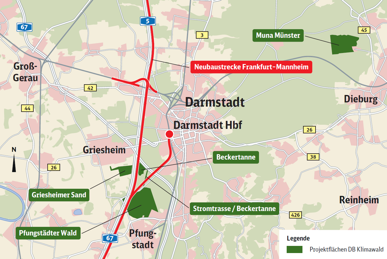 Auf einer Gesamtfläche von rund 500 Hektar vernetzt die Deutsche Bahn sensible Lebensräume im Raum Südhessen miteinander und stärkt so nachhaltig die Biodiversität. Der DB-Klimawald umfasst fünf verschiedene waldökologische Teilprojekte: den klimastabilen Waldumbau im Pfungstädter Wald, die Förderung einer natürlichen Waldentwicklung mit Offenlandflächen in der Muna Münster, die Errichtung von Binnendünen unterhalb der Stromtrasse in der Beckertanne, das Pilotprojekt resilienter Bahnwaldrand im Griesheimer Sand sowie die Erhaltung alter lichter Eichenwälder in der Beckertanne nahe Darmstadt.