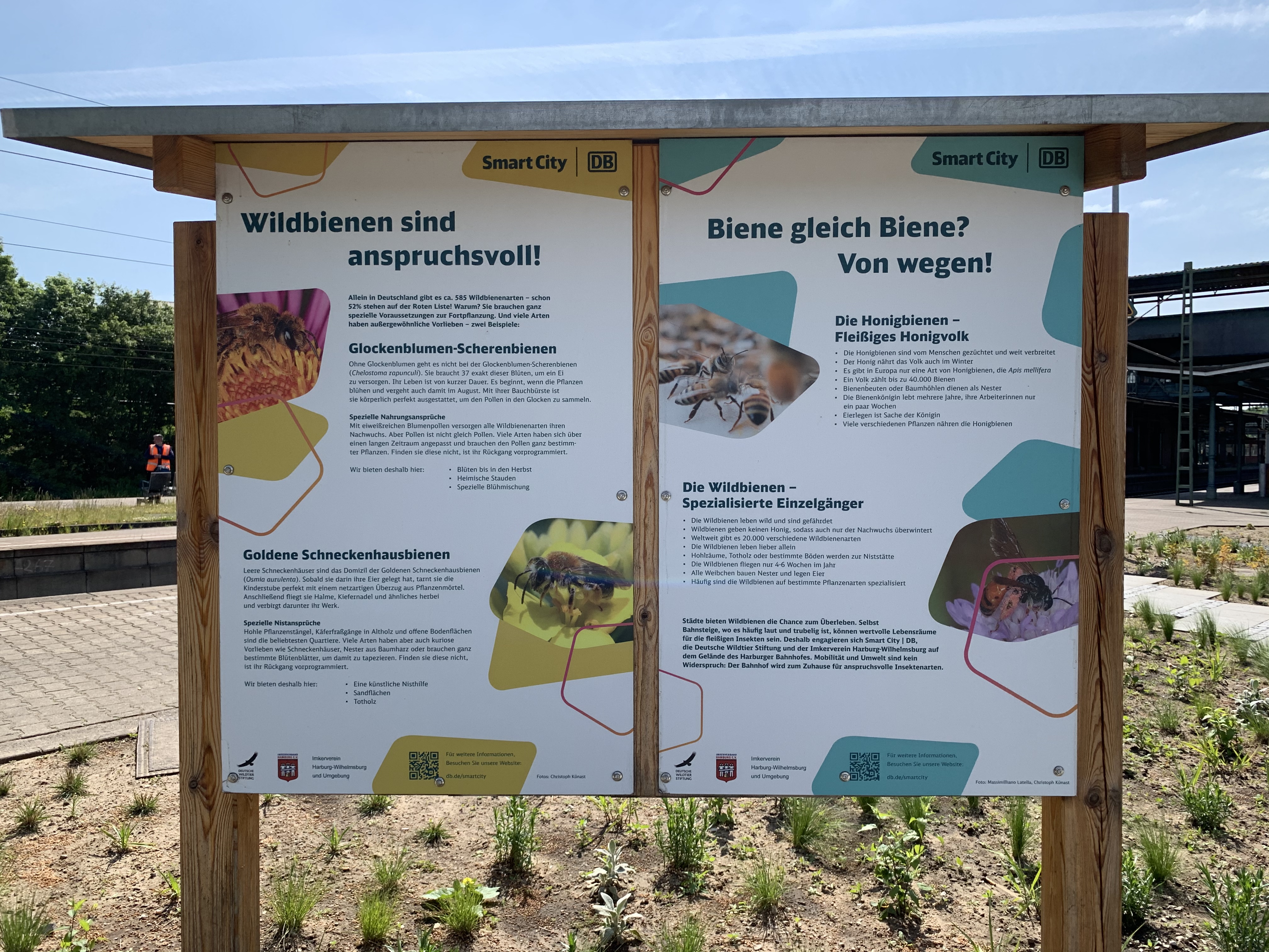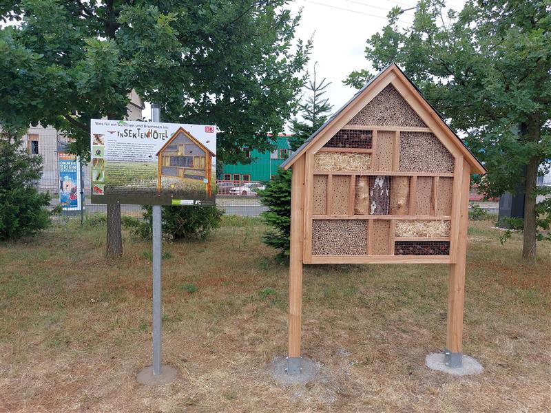 Am Bahnhof Hamburg-Harburg hat die DB beispielsweise die Flächen rund um die Bahnsteige neu begrünt und ein Insektenhotel errichtet. Darin können Mauerbienen, Marienkäfer und andere Fluggäste nisten und sicher überwintern. Auch am Zukunftsbahnhof Renningen in Baden-Württemberg stehen auf der dort angelegten Schmetterlingswiese mehrere NABU-zertifizierte Insektenhotels. Weitere sollen folgen.