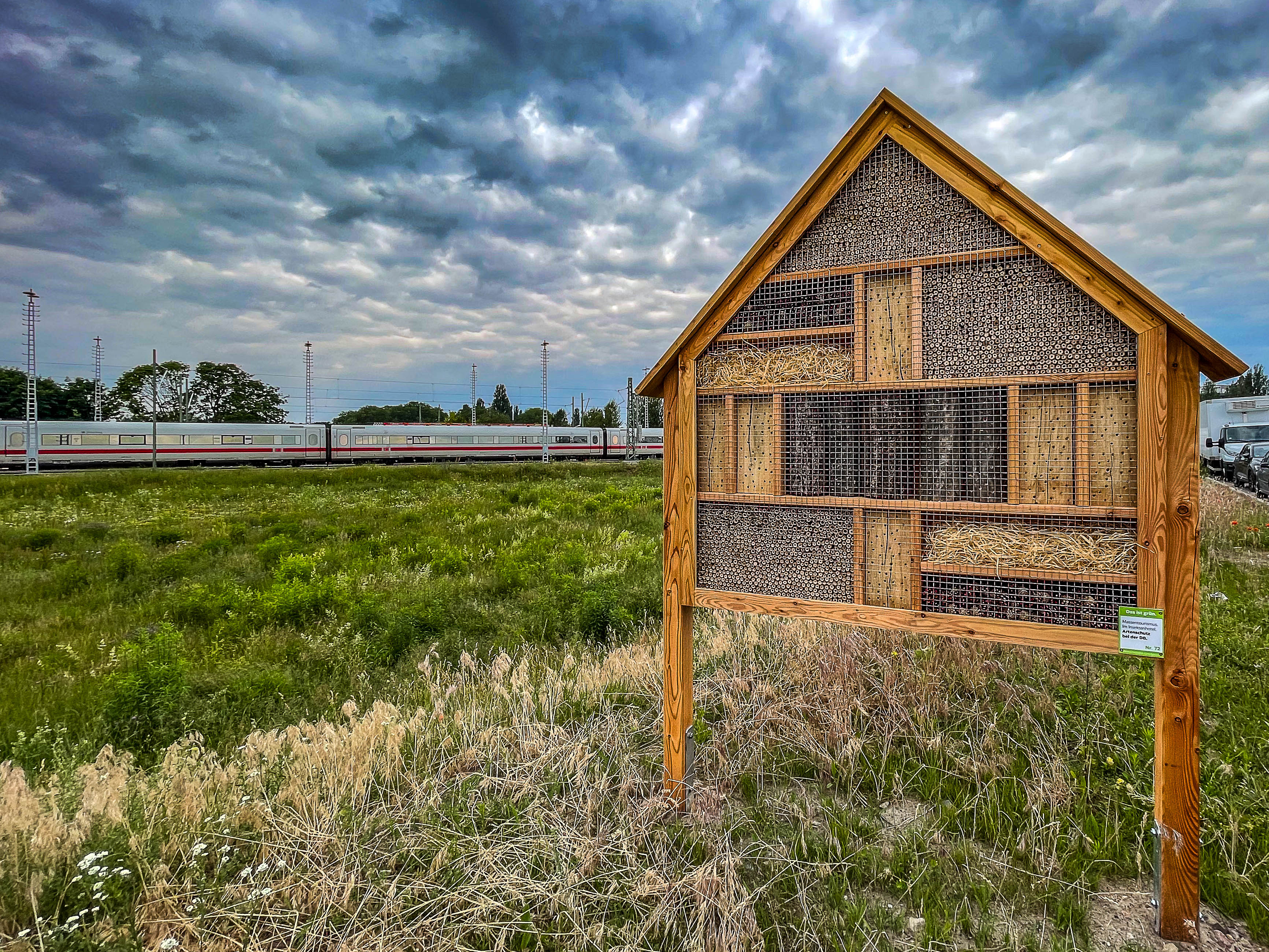An den ICE-Instandhaltungswerke Rummelsburg in Berlin und in Leipzig stehen an jedem Standort zwei Insektenhotels. Gemeinsam mit dem Partner gartenetage hat die Deutsche Bahn dort eine neue Heimat für Hummeln, Bienen, Schmetterlinge und Co. geschaffen. In Rummelsburg stehen die rustikalen Insektenhotels mit Schieferdach direkt neben einer 2800 Quadratmeter großen Regenwasserversickerungsfläche, auf der eine Wildblumenwiese ausgesät wurde.