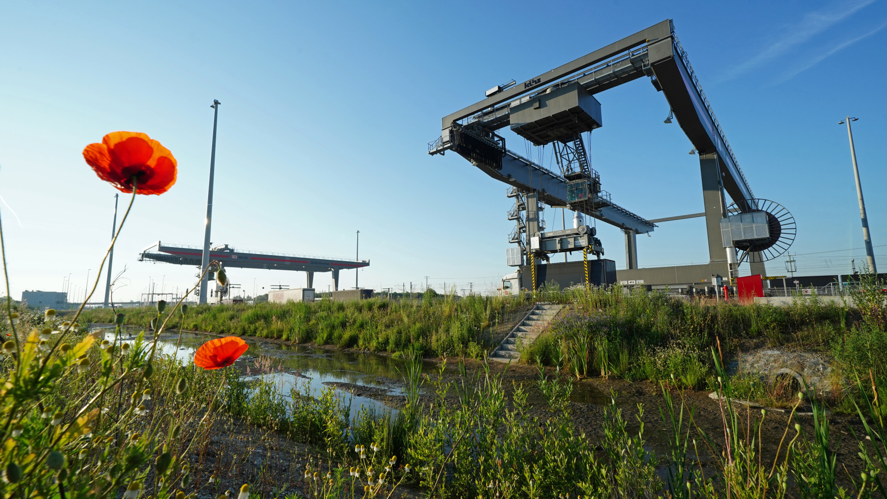 Das Auf- und Abladen übernehmen die rund 20 Meter hohen halbautomatischen Portalkrane. Sie heben die bis zu 40 Tonnen schweren Ladeeinheiten zwischen den Güterzügen oder zwischen Zug und Lkw hin und her. Die Krane arbeiten besonders energieeffizient: Unverbrauchte Bremsenergie wird aufgefangen, in den Stromkreislauf zurückgespeist und kann an anderer Stelle genutzt werden. Darüber hinaus berechnet eine Software den effizientesten Weg für die Krane und AGVs zu ihrem Zielort.