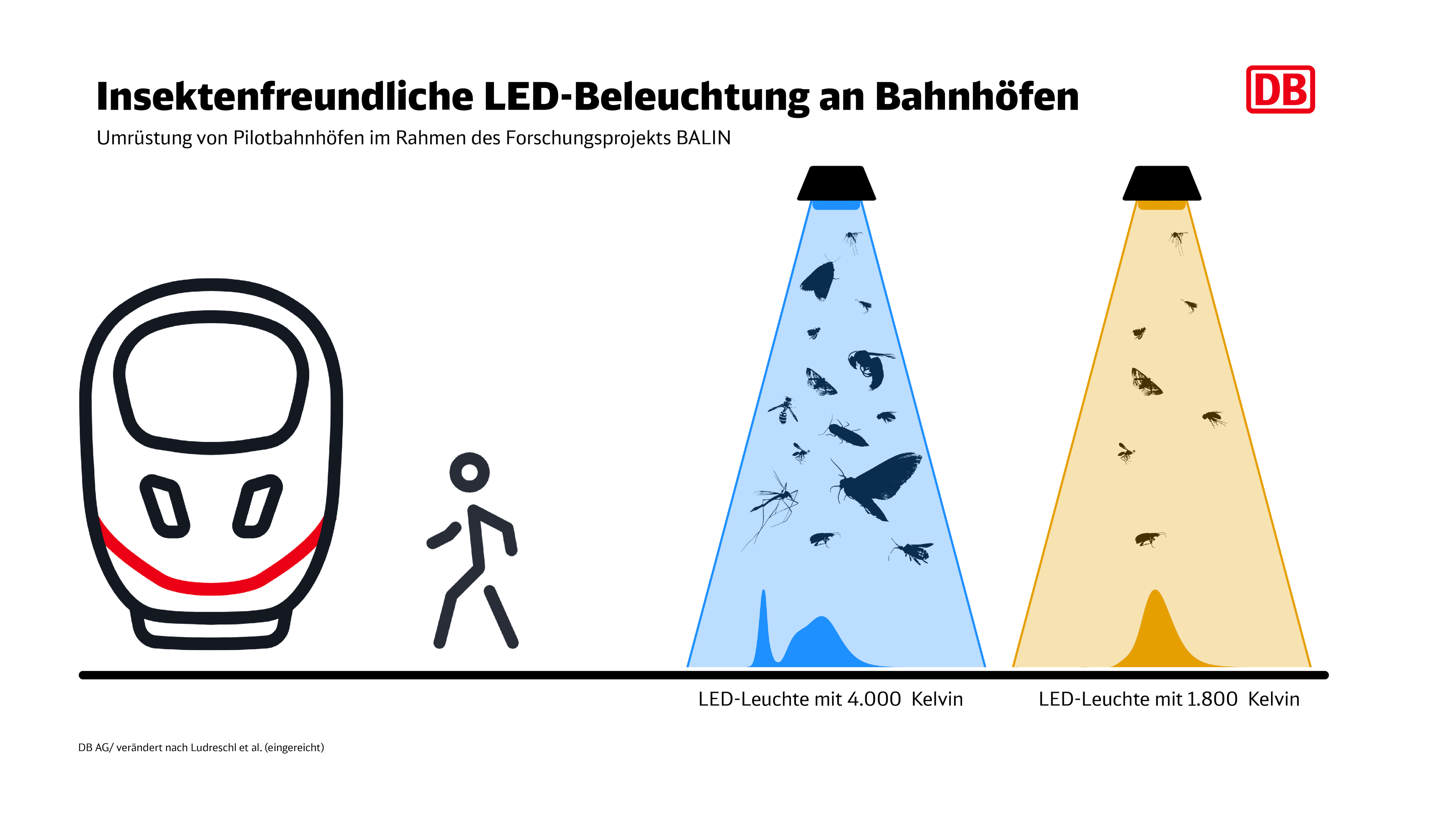 In dem mehrjährigen Projekt „Insektenschutz an Bahnhöfen durch insektenfreundliche Beleuchtung“ (BALIN) hat die Deutsche Bahn mit externen Partnern untersucht, wie durch den Einsatz alternativer Lichtquellen ein positiver Beitrag zum Insektenschutz geleistet werden kann. Dafür hat die DB sechs Bahnhöfe mit insektenfreundlicher Beleuchtung ausgestattet. Mit Hilfe von sogenannten Kreuzfensterfallen wurde dabei die Anziehungskraft der Leuchtmittel auf die Insekten untersucht.