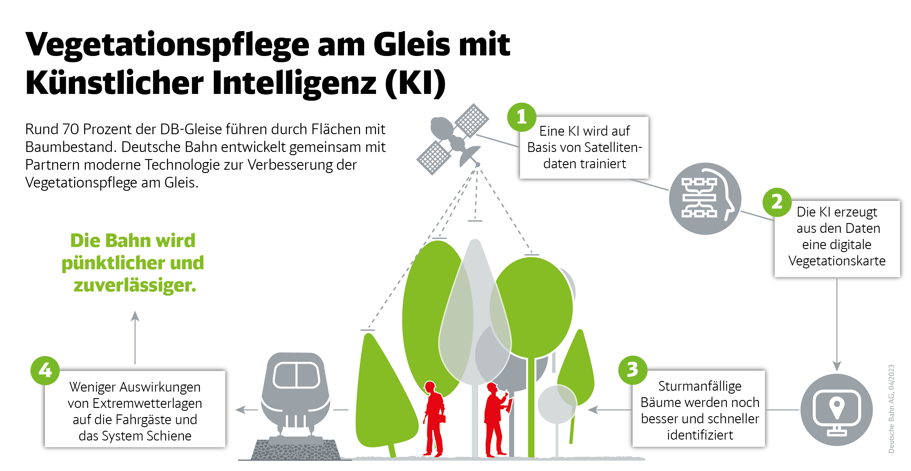 Bei der Inspektion und Pflege der angrenzenden Waldflächen sind hunderte von Fahrwegpfleger:innen und Förster:innen bei der DB im Einsatz. Zusätzlich nutzt die Deutsche Bahn Satellitendaten, um den Baumbestand ganzjährig im Blick zu behalten. Mittels Künstlicher Intelligenz werden diese zu digitalen Vegetationskarten verarbeitet. So können sturmanfällige Bäume schneller erkannt und das Schienennetz robuster und wetterfester gemacht werden.