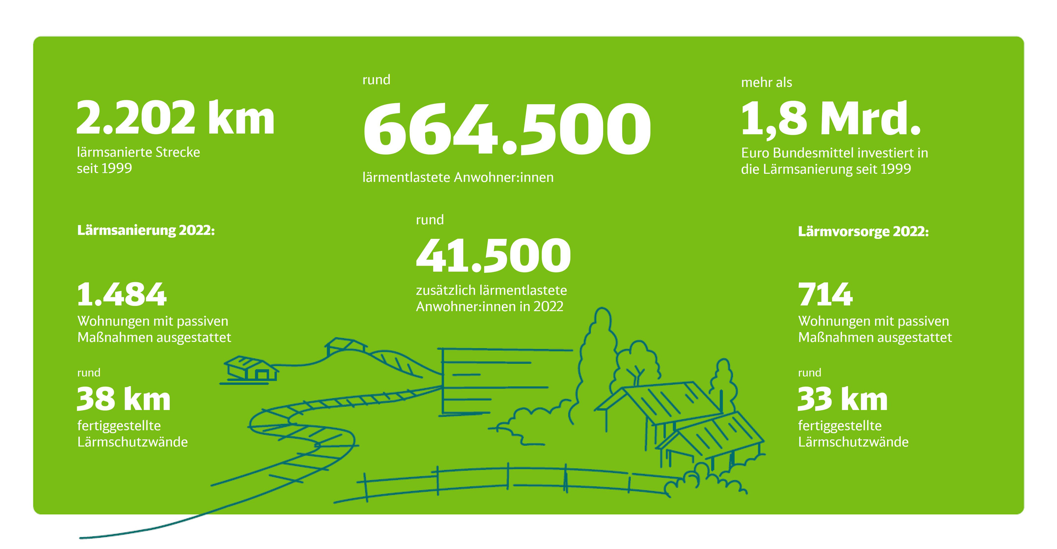 Im Rahmen des freiwilligen Lärmsanierungsprogramms des Bundes wurden im vergangenen Jahr rund 1.500 Wohnungen mit passiven Schallschutzmaßnahmen ausgestattet. Zudem wurden weitere rund 38 Kilometer Lärmschutzwände an Bestandsstrecken errichtet – und damit bundesweit rund 770 Kilometer Lärmschutzwände seit Beginn des Programms im Jahr 1999.