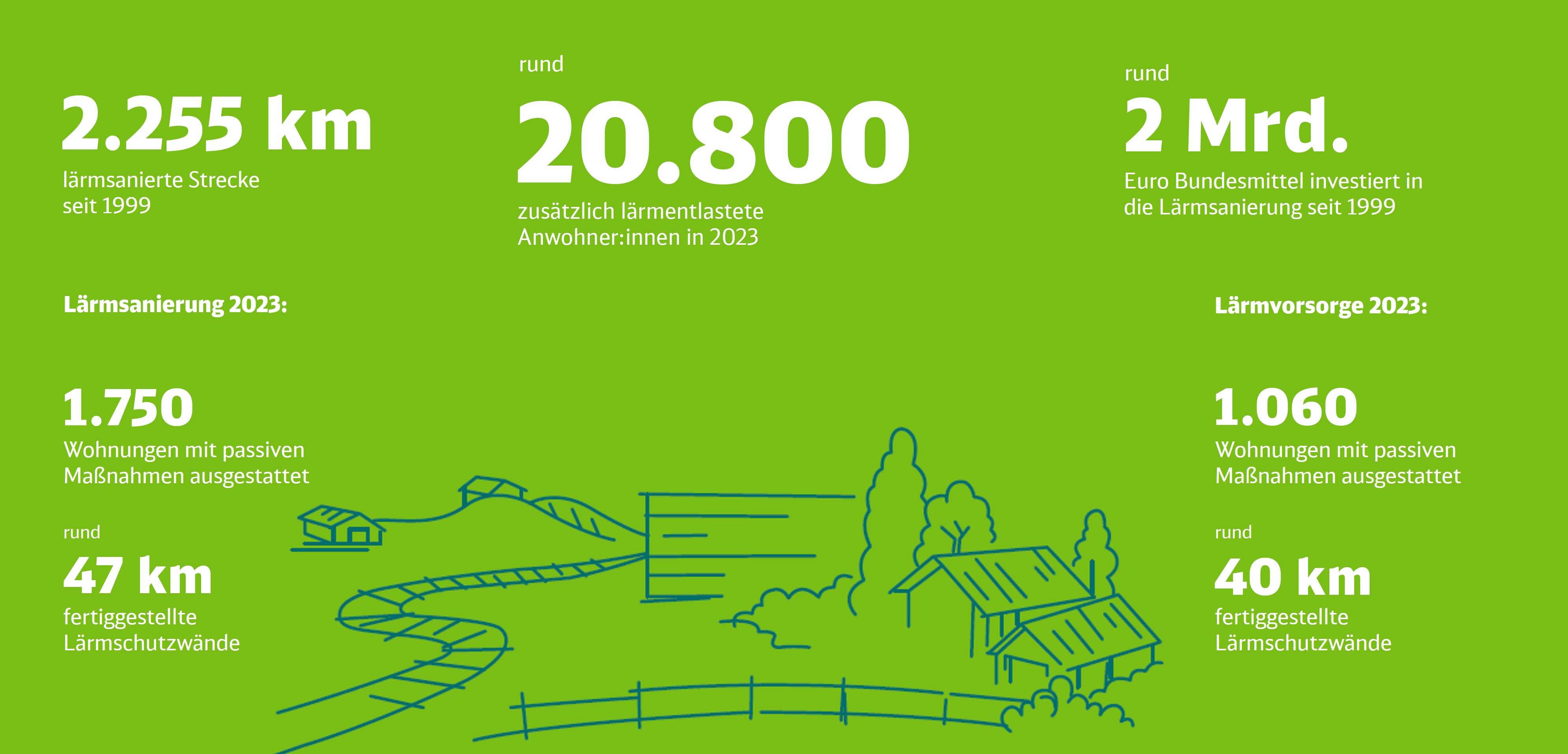 Lärmschutz spielt nicht nur bei Bestandsstrecken, sondern auch bei Neu- und Ausbaustrecken eine wichtige Rolle. So wurden im Jahr 2023 rund 40 Kilometer Lärmschutzwände im Rahmen der Lärmvorsorge fertiggestellt. Zudem konnten weitere 1.060 Wohnungen mit passiven Schallschutzmaßnahmen ausgestattet werden.