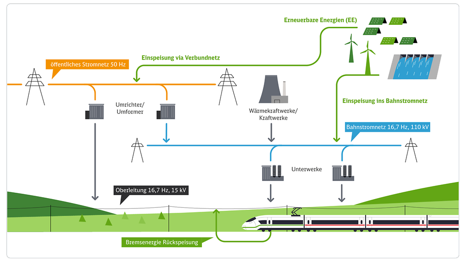 Um die Herkunft des genutzten Stroms eindeutig nachzuweisen, setzt die DB auf Herkunftsnachweise. Der Strombezug basiert dabei auf dem gleichen Prinzip wie klassische Ökostromverträge: Ein definierter Anteil an Strom aus erneuerbaren Energiequellen – etwa aus Windkraft- oder Photovoltaikanlagen – wird in das öffentliche Stromnetz eingespeist und über Umformer und Umrichter ins Bahnstromnetz weitergegeben.