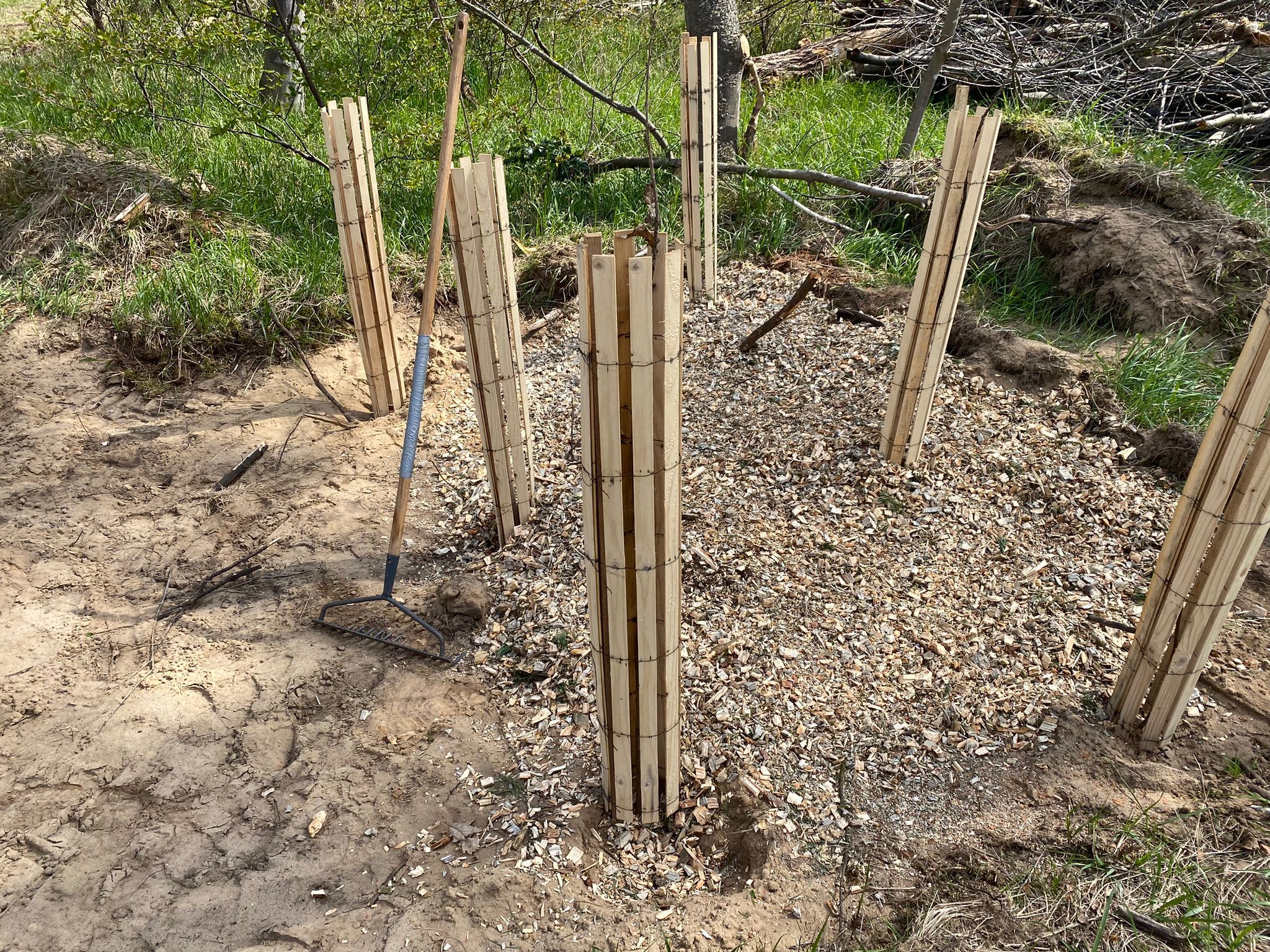 To secure the future of Pfungstädter Wald, it must be sustainably transformed. Hot, dry summers have shown the vulnerability of the existing monoculture forest. Many conifers are already dead and are easy prey for bark beetles, Maybugs and various plant diseases. On about 250 hectares, the Ökoagentur Hessen is planting over 100,000 trees and shrubs by 2030 on behalf of DB. The goal is a climate-resilient mixed forest of native trees such as oaks, hornbeams, and wild service trees. Nine native tree and shrub species are planted together in what are known as nests. The planting sites are then covered with woodchippings to protect them from the dry conditions and from browsing by wild animals. This is because the fresh buds are at the top of the menu for deer and other wild animals.This allows a richly structured forest to emerge that offers protection and habitat to many animal species while also being able to withstand the changing climatic conditions.