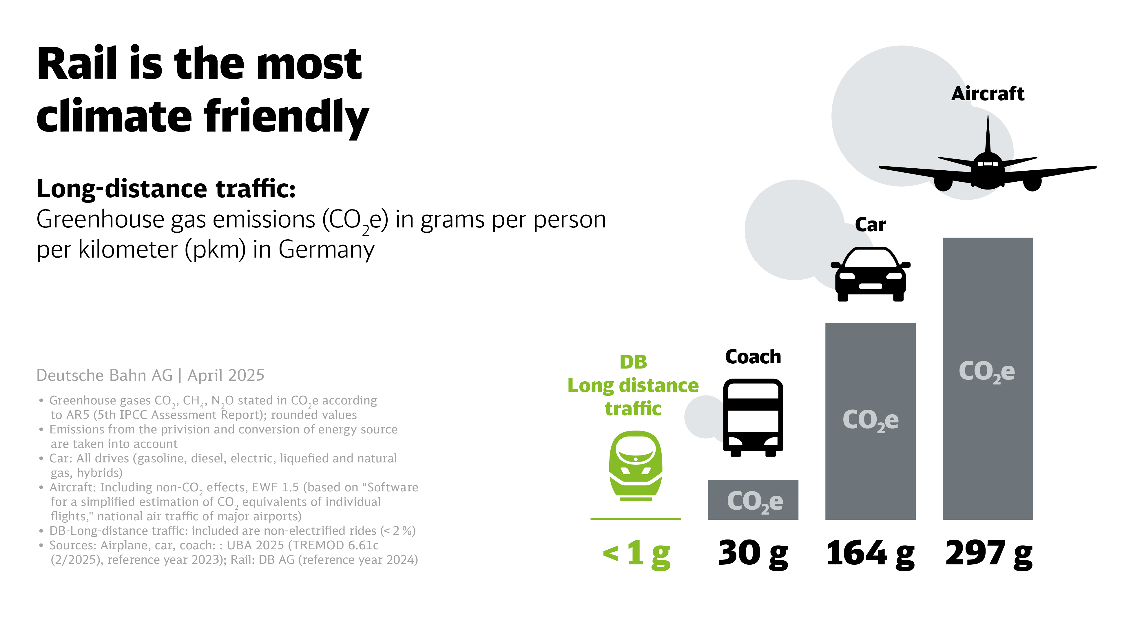 The following graphic also shows how climate-friendly Deutsche Bahn's long-distance transport is compared to other modes of transport. It displays the average greenhouse gas emissions in grams per person per kilometer in Germany: