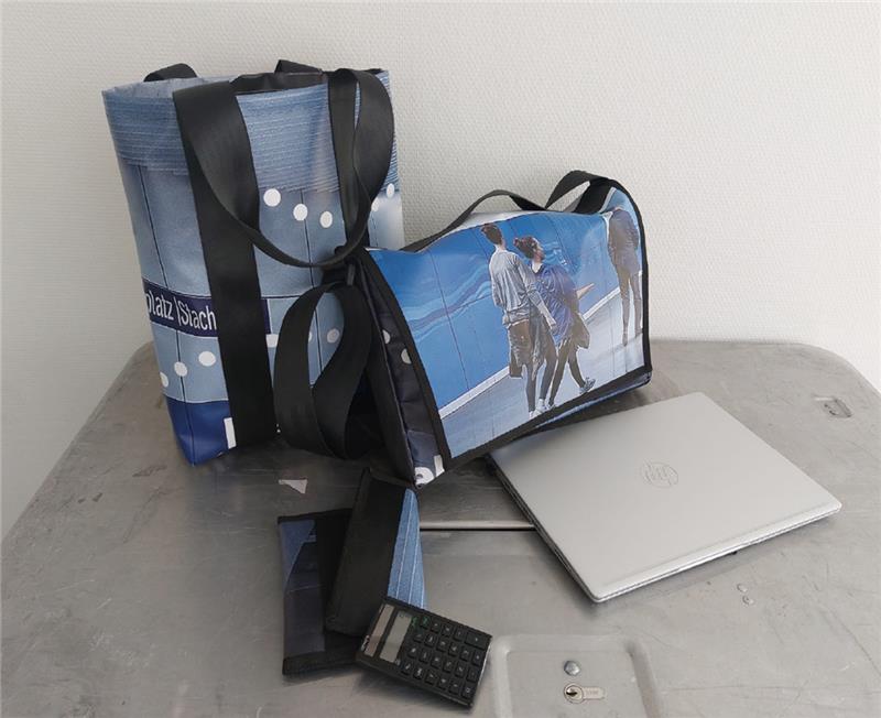 A DB internal service provider for media and communication technology, for example, makes pencil cases as well as laptop and shopping bags from old construction and advertising banners.