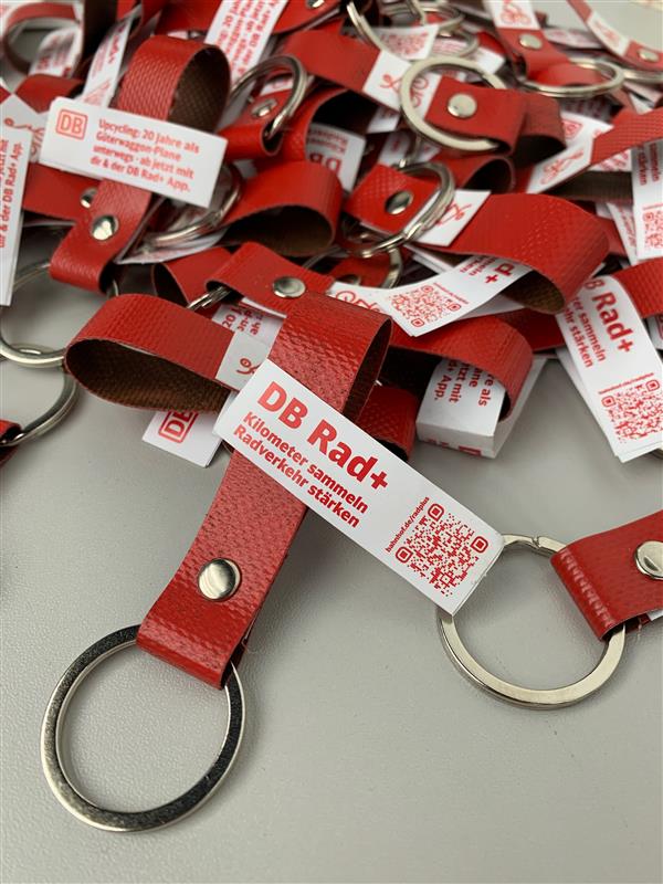 Parts of the red tarpaulins from DB Cargo freight cars are also used for upcycling. At various events such as trade fairs, visitors can actively create keychains and other giveaways from these materials.