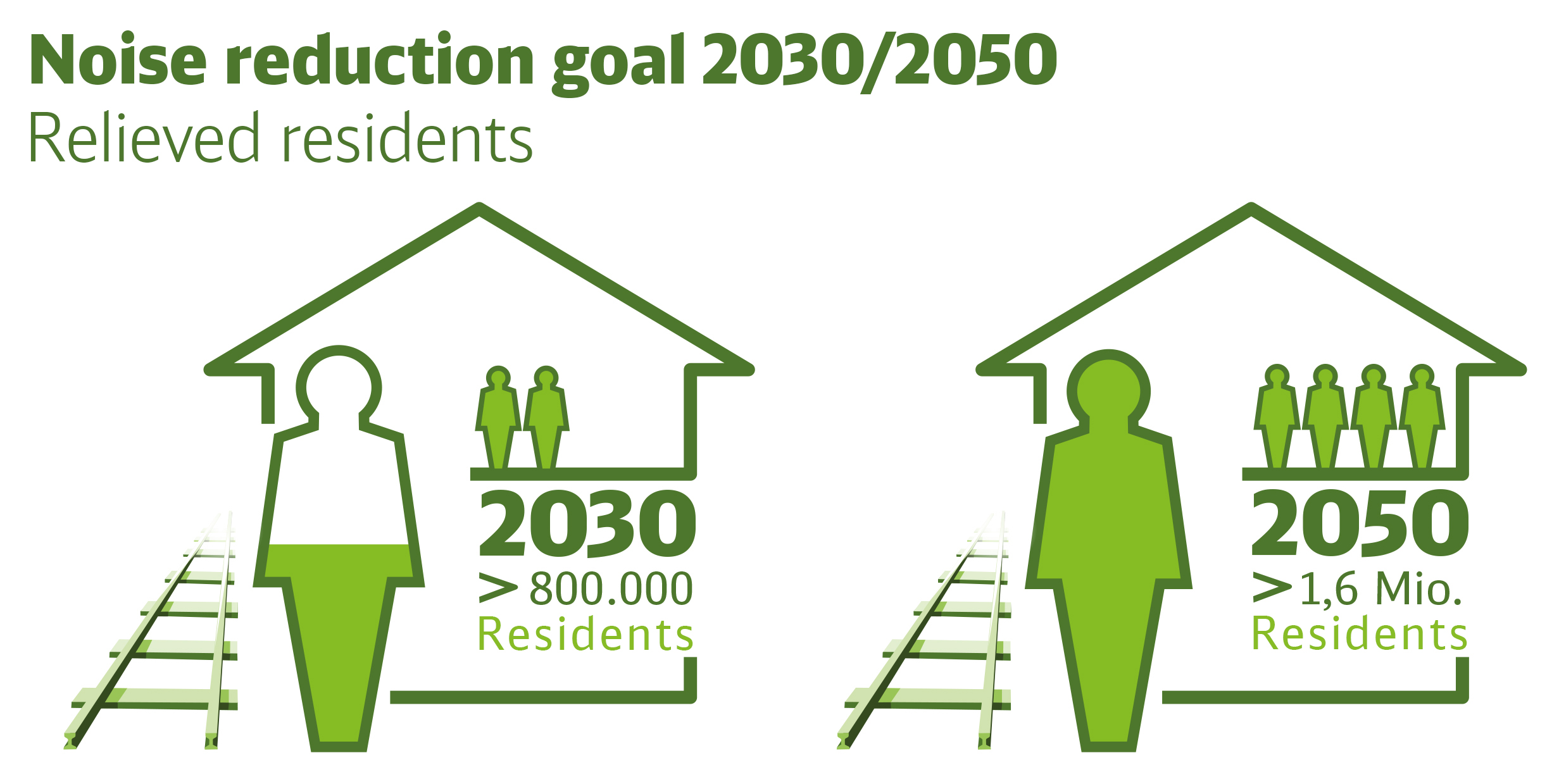 By 2030, Deutsche Bahn and the federal government aim to reduce rail noise for more than 800,000 residents as part of their noise abatement program. That is more than half of all residents who currently live along noisy rail lines. And by 2050, rail noise will be reduced for all affected residents.